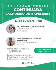 O Programa de Educação Médica Continuada (PEC) do CRM-ES chega a Cachoeiro de Itapemirim , no próximo dia 13 de outubro, com duas palestras: AVC: Hemorrágico e Isquêmico, ministrada pela neurologista, Dra. Rubia Sfalsini e Emergências Toxicológicas na Infância, ministrada pelo pediatra, Dr. Valmin Ramos da Silva.