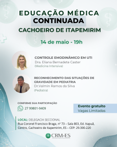O Programa de Educação Médica Continuada (PEC) do CRM-ES chega a Cachoeiro de Itapemirim, no próximo dia 14 de Maio, com a palestra Controle Emodinâmico em UTI, ministrada pela Intensivista Dra. Eliana Bernadete Caster e Reconhecimento de Situações de gravidade em Pediatria ministrada pelo pediatra, Dr.Valmin Ramos da Silva.