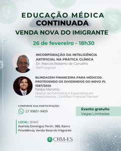 O Programa de Educação Médica Continuada (PEC) do CRM-ES chega a Venda Nova do Imigrante, no próximo dia 26 de fevereiro, com a palestra Incorporação da Inteligência Artificial na Prática Clínica, ministrada pelo nefrologista Dr. Marcos Roberto de Carvalho e Blindagem Financeira para Médicos: Protegendo os dividendos do novo PL 1087/2025, ministrada pelo gestor de patrimônio e especialista em investimentos Felipe Merotto.