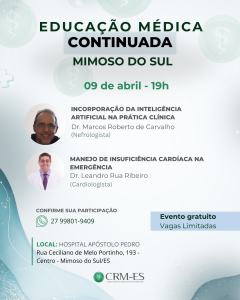O Programa de Educação Médica Continuada (PEC) do CRM-ES chega a Mimoso do Sul, no próximo dia 9 de abril, com a palestra Incorporação da Inteligência Artificial na Prática Clínica, ministrada pelo nefrologista Dr. Marcos Roberto de Carvalho e Manejo de Insuficiência Cardíaca na Emergência, ministrada pelo cardiologista Dr. Leandro Rua Ribeiro.