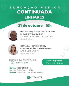 O Programa de Educação Médica Continuada (PEC) do CRM-ES chega a Linhares, no próximo dia 31 de outubro, com duas palestras: Cefaleia – Diagnóstico, Classificação e Tratamento, ministrada pela neurologista, Dra. Rubia Sfalsini e Incorporação do Chat GPT e da IA na prática clínica, ministrada pelo nefrologista, Dr. Marcos Roberto de Carvalho.