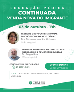 O Programa de Educação Médica Continuada (PEC) do CRM-ES chega a Venda Nova do Imigrante, no próximo dia 3 de outubro, com duas palestras: Febre de Oropouche: Sintomas, Diagnóstico e Manejo Clínico, ministrada pela infectologista, Dra. Tâmea Aparecida Linhares e Terapias Hormonais em Ginecologia: Abordagens e Aplicações Clínicas, ministrada pelo ginecologista, Dr. Sergio Rua.